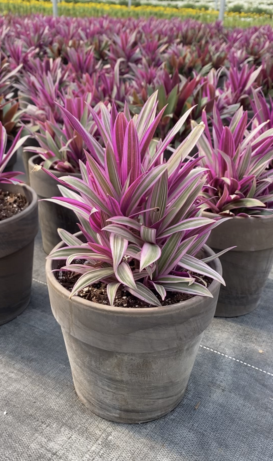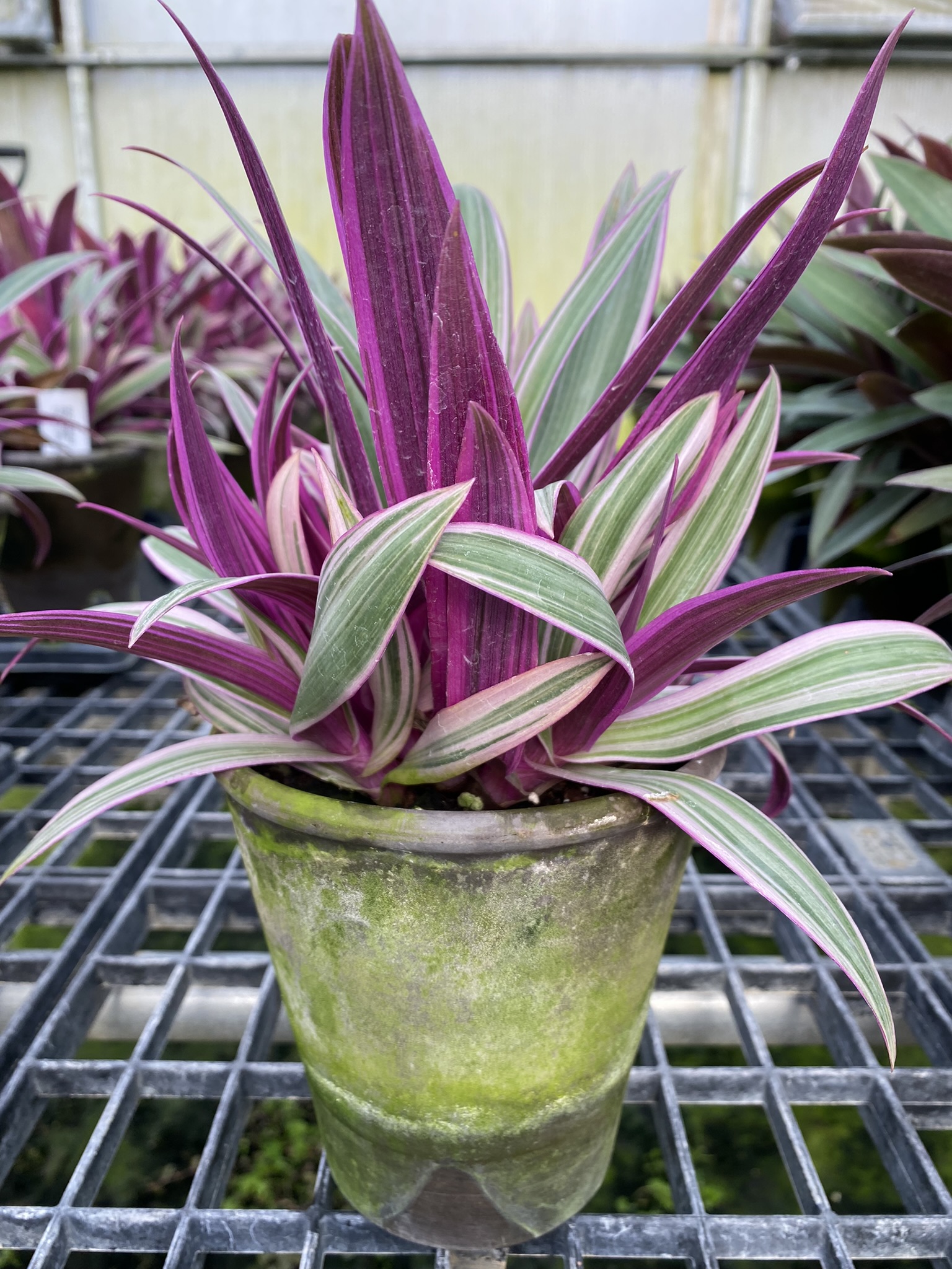 We typically grow Moses in the Cradle plants in purple and tri-color varieties in 4″, 5″, 6″, 7″, 8″, and 10″ clay pots and clay bowls