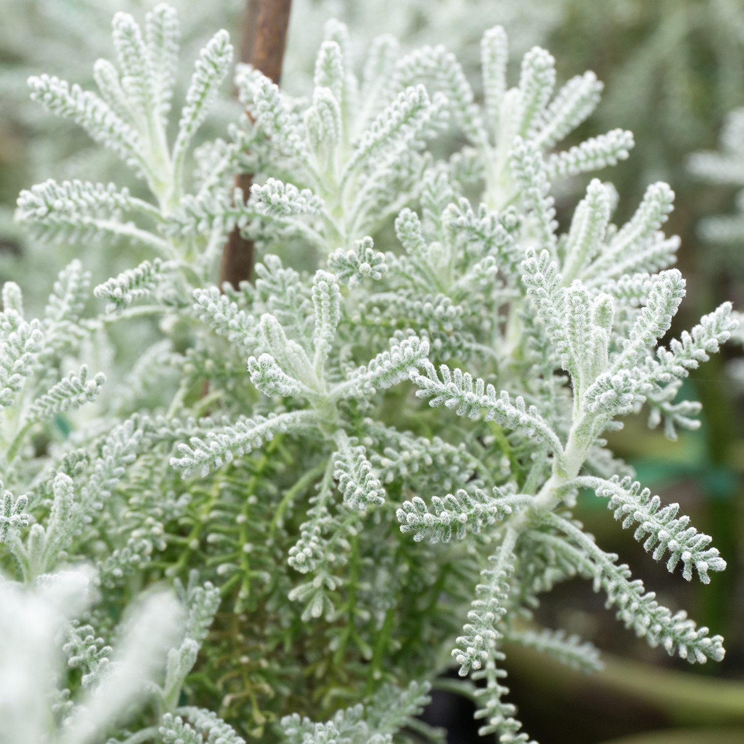 A compact, silver-gray shrub with fine, aromatic foliage and yellow button-like flowers. Drought-tolerant and great for sunny, dry areas.