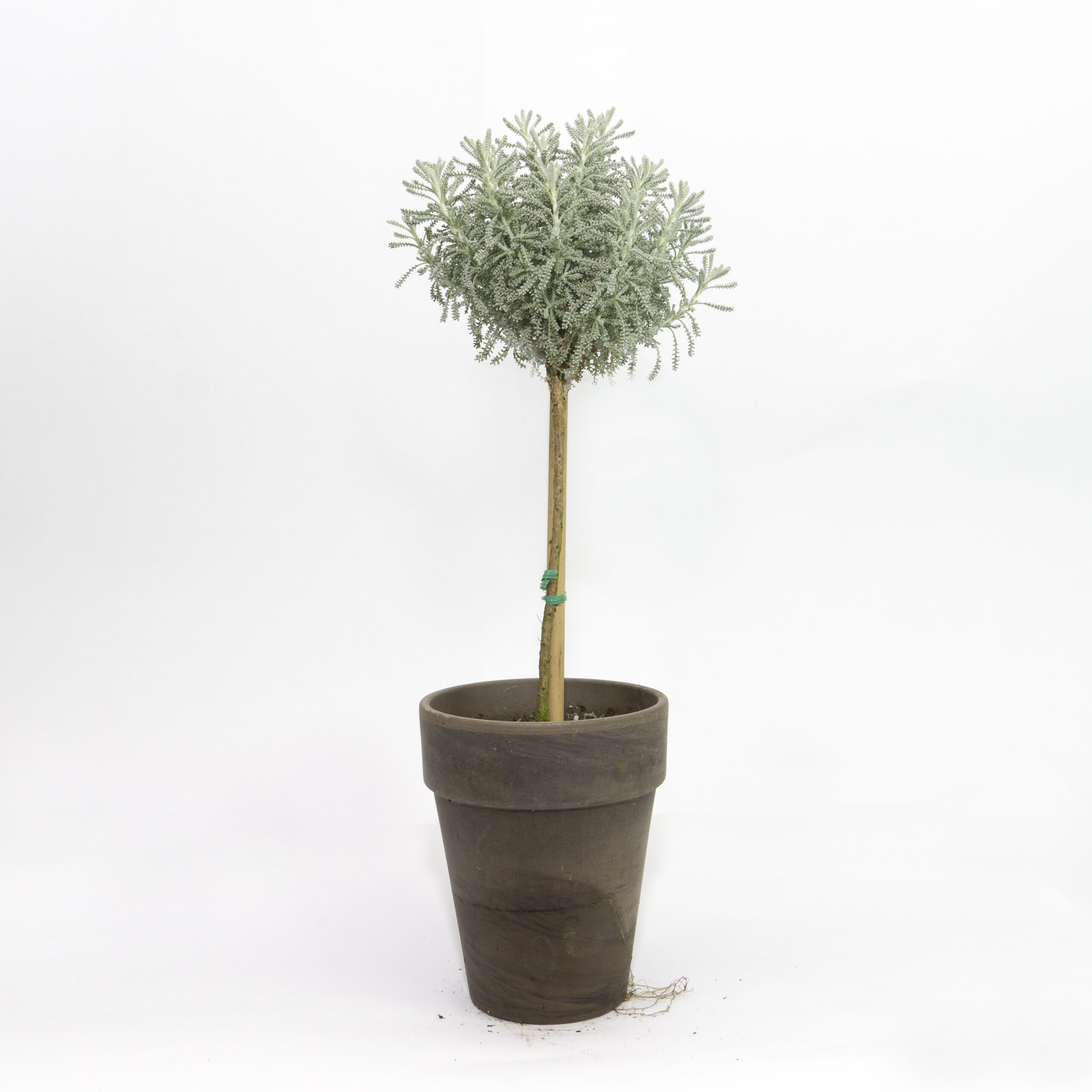 We typically grow Santolina in topiary form in 4″ and 5″ clay pots